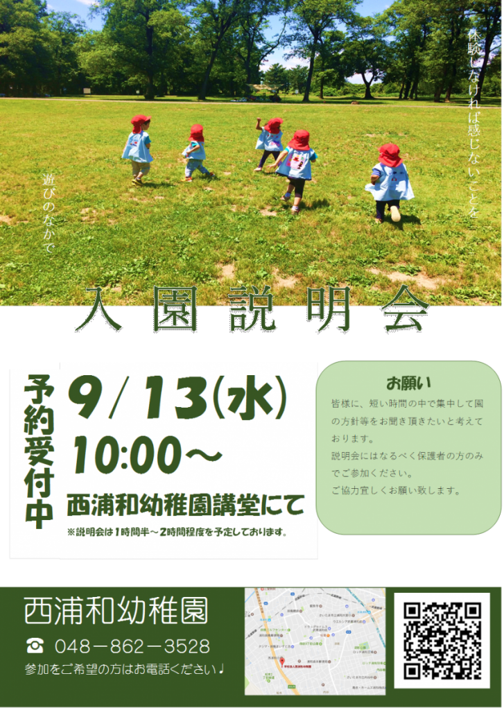 入園説明会のお知らせ 2017.09.01 行事・イベント 平成30年度の入園説明会を行います。 9月13日(水)10:00~ 西浦和幼稚園の講堂へお集まりください。 皆様に、短い時間の中で集中して園の教育方針などを お聞き頂きたいと思っておりますので、 出来る限り保護者の方のみでのご参加をお願いしております。 ご協力お願い致します。 参加ご希望の方は、お電話にてお申込みください。 お待ちしております♩♪ 一覧を見る