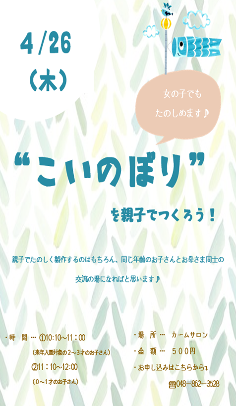 4月親子教室のお知らせ 2018.04.18 4月26日(木) カームサロンで、親子教室を行います。 こどもの日の準備をしよう!ということで、 今月は「こいのぼり」を親子で作りましょう♪ 製作を楽しむのはもちろん、 おなじ地域で、おなじ年齢のお子さんをもつお母さま同士の 交流の場になればと思っています。 ぜひご参加ください♩☆ 一覧を見る