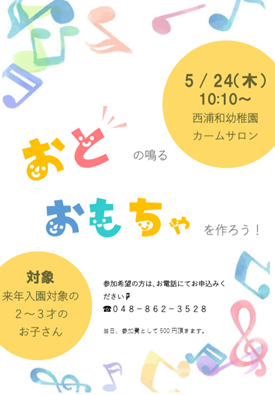 5月親子教室のお知らせ 2018.05.16 行事・イベント カームサロン 親子教室 5月24日(木) 幼稚園のカームサロンで親子教室を行います! ☆2~3歳児 2~3歳は「音の鳴るおもちゃを作ろう」ということで、 ひよこのパンチボールを作ります♪ ☆0~1歳児 0~1歳は「動きが楽しいおもちゃを作ろう」ということで、 ちょうちょうのおもちゃを作ります! 同年齢のお子さん同士、お母さま同士の交流にもなるので、 ぜひ遊びにきてくださいね♪ みなさんのご参加お待ちしております。 (お申し込みはこちら 048-862-3528 から) 一覧を見る