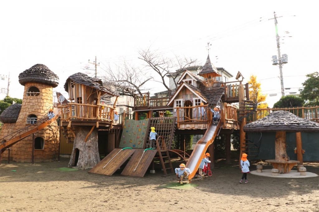 山や森などの環境に触れる機会の少ない子どもたちが、日々の遊びから自然を感じられるようにと、木の風合いや形状をそのまま活かした素敵な遊具を建てて下さいました。