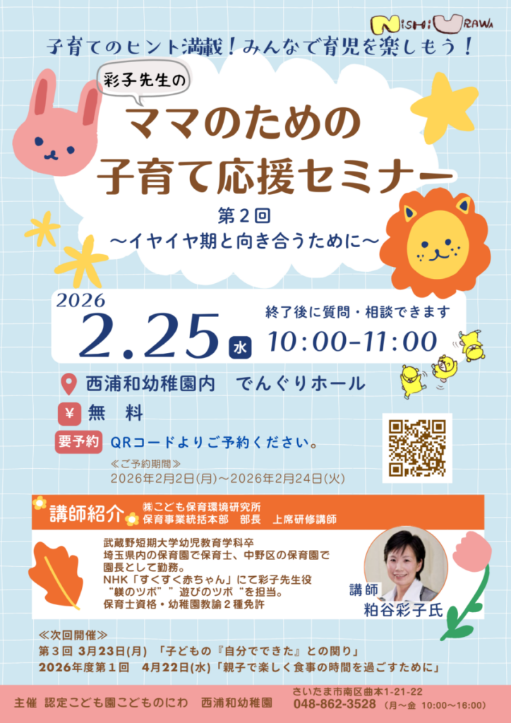 2月の子育てセミナーは「イヤイヤ期と向き合うために」をテーマに開催いたします。