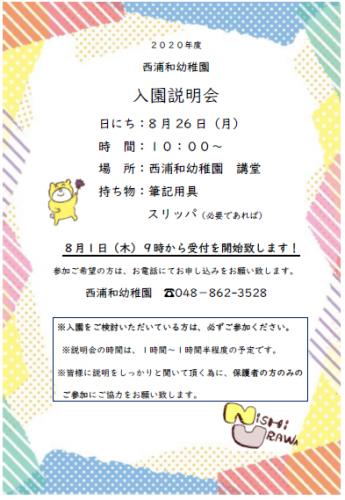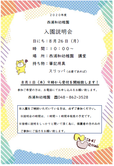 入園説明会について 2019.07.04 8月26日(月)10:00~ 2020年度入園説明会を行います! 西浦和幼稚園ってどんな所だろう?と思っている方も、 説明会にお越し頂くことで、幼稚園や子ども達の雰囲気を見て頂けると思います。 参加ご希望の方は、048-862-3528までお電話ください。 皆さまのご参加お待ちしております! ※画像をクリックして頂けると、拡大されます。 一覧を見る