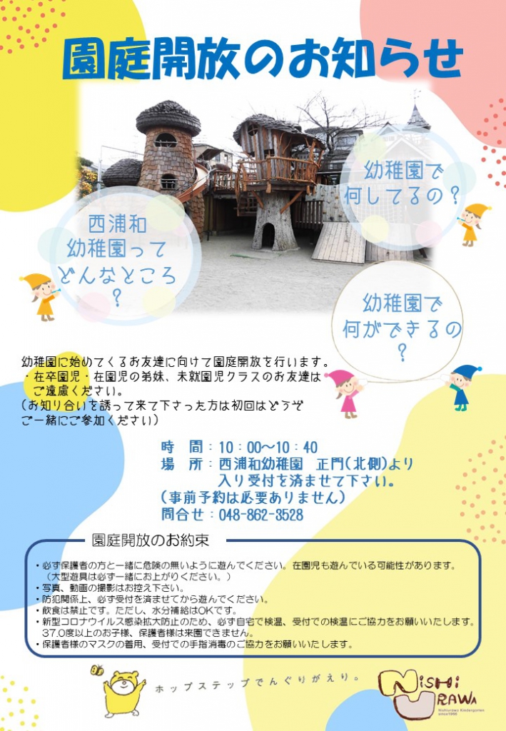 2月の園庭開放のお知らせ *お約束* 2023.01.24 親子教室 2月1日(水)・2月15日(水)・2月22日(水) 時間: 10:00~10:40 受付場所: 西浦和幼稚園正門(北側)より入りまして受付を済ませて下さい! 事前予約はいりません!! 一覧を見る